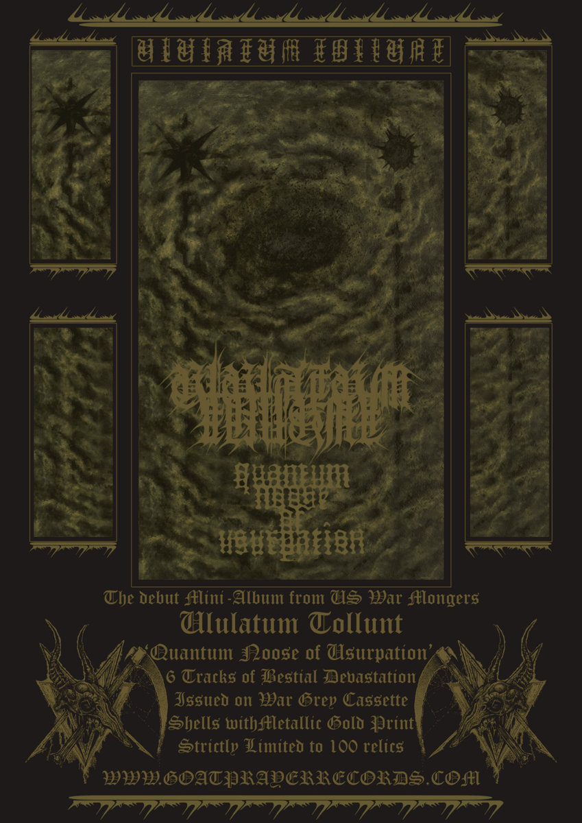 GOATPRAYER RECORDS presents ULULATUM TOLLUNT's debut mini-album, Quantum Noose of Usurpation. A relatively new entity formed in 2015 and hailing from various parts of the United States, ULULATUM TOLLUNT originally self-released an initial pressing of Quantum Noose of Usurpation, under a different title and in extremely limited quantities, but it exhibited a shockingly mature sound - and one so shockingly severe, leaving us with no other recourse but to unleash Quantum Noose of Usurpation upon the international metal underground.